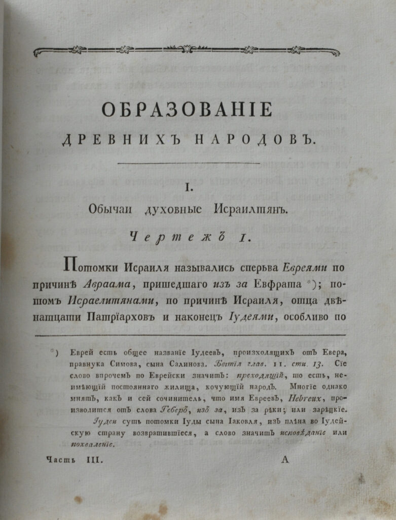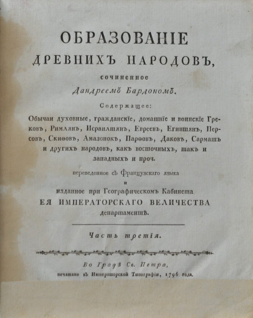 Дандре-Бардон Мишель Франсуа. Образование древних народов, сочиненное Дандреем Бардоном. Содержащее: обычаи духовные, гражданские, домашние и воинские греков, римлян, исраилтян, евреев, египтян, персов, скифов, амазонок, парфов, даков, сармат и других народов, как восточных, так и западных и проч. переведенное с французскаго языка и изданное при Географическом Кабинета ея имп. величества департаменте : [в 4 ч.] / [соч.] Дандреем Бардоном ; пер. Я.И. Булгакова.