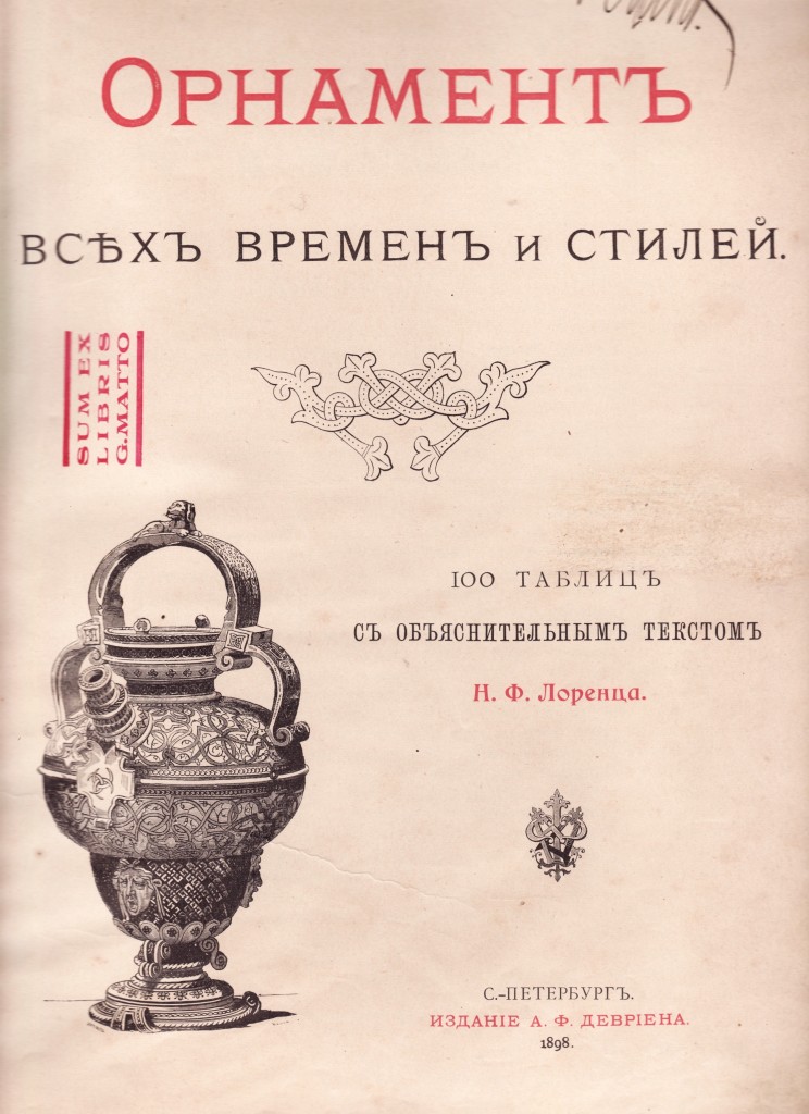 Лоренц Н.Ф. “Орнамент всех времён и стилей”. С.-Петербург, Издание А.Ф. Девриена, 1898.