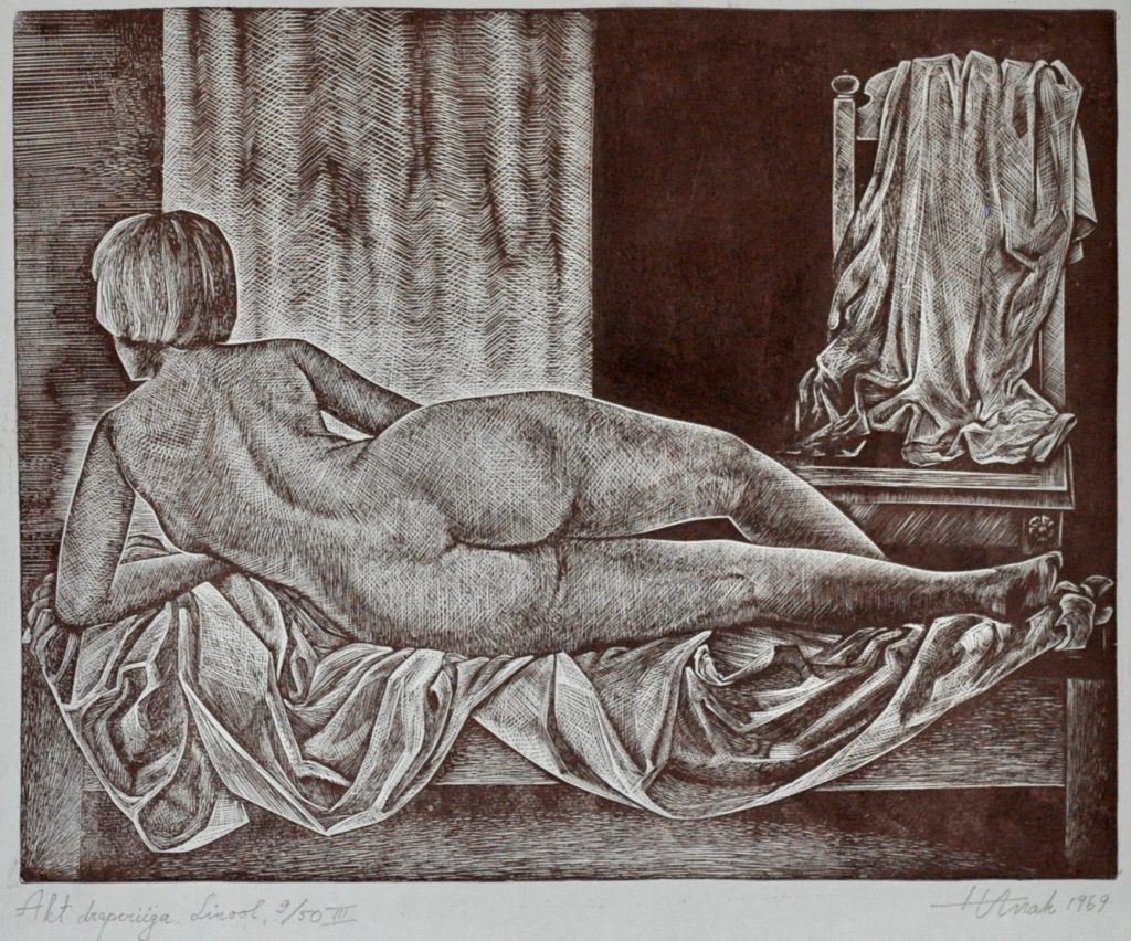 “Akt draperiiga” 1969 linool 9/50 III leht 32×45 cm kujutis 30,5×24 cm