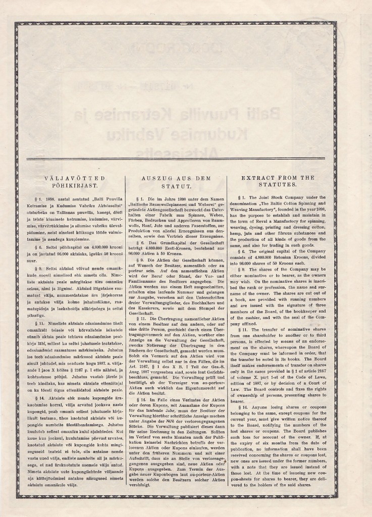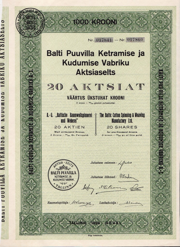 Balti Puuvilla Ketramise ja Kudumise Vabriku Aktsiaselts 20 aktsiat 1928