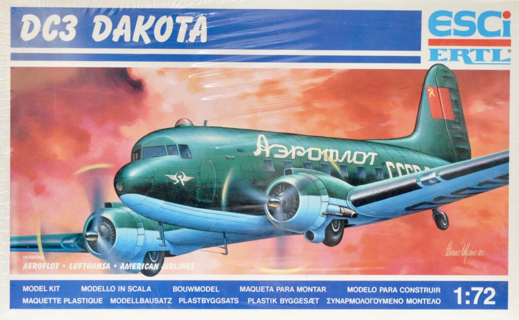 Brand:ESCI/ERTLTitle:Douglas DC-3 DakotaNumber:9123 (Also listed as 9123-E10FO)Scale:1:72Type:Full kitReleased:1992 New decalsBarcode:8002343091235 (EAN)Packaging:Rigid box (Top opener)Topic:Douglas DC-3 » Propeller (Aircraft)
