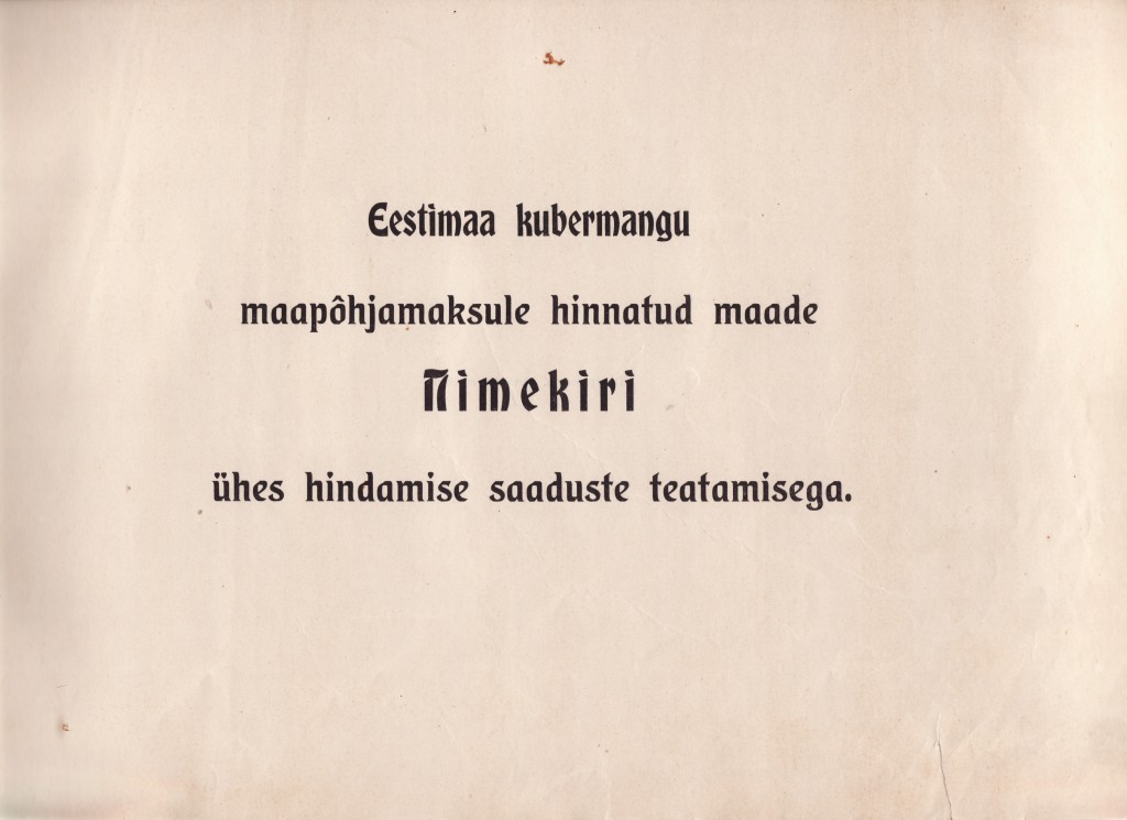 Eestimaa kubermangu maapõhjamaksule hinnatud maade Nimekiri ühes hindamise saaduste teatamisega