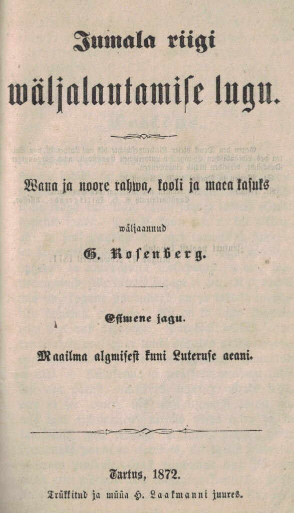 Jumala riigi wäljalautamise lugu. Esimene jagu, Maailma algmisest kuni Luteruse aeani / Wana ja noore rahwa, kooli ja maea kasuks wäljaannud G. Rosenberg