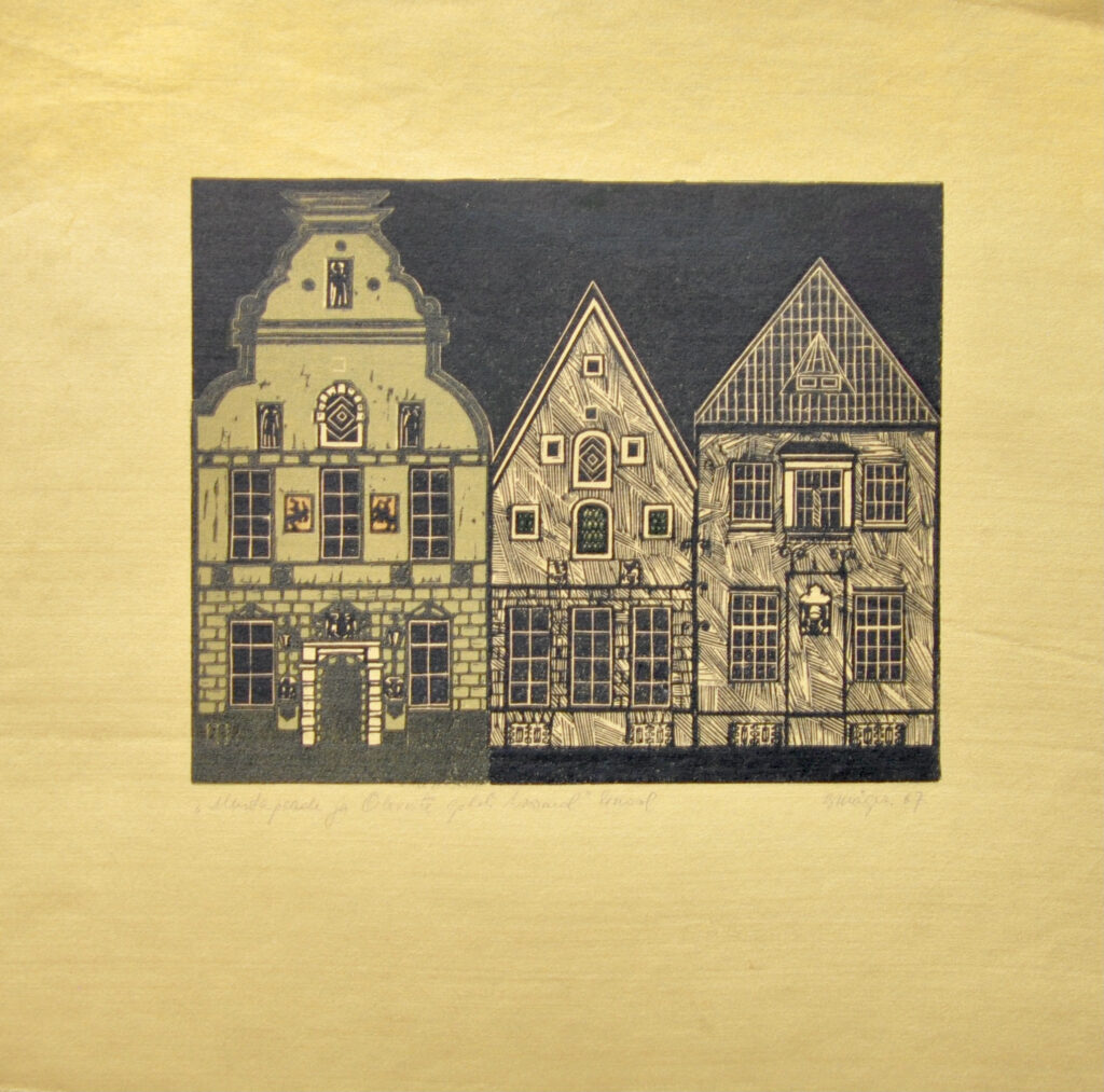 “Mustpeade ja Oleviste gildi hooned ” 1967 sign linool kuldsel paberil kujutis 20×25 paber 40×43 cm
