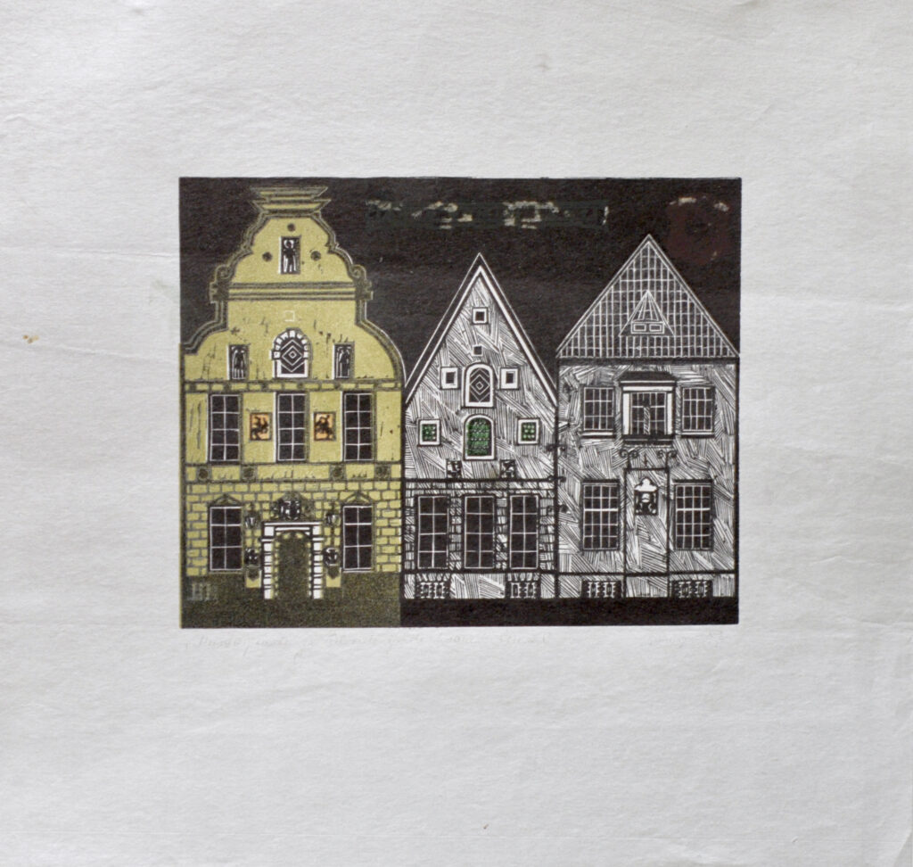 “Mustpeade ja Oleviste gildi hooned ” 1967 sign linool hõbedasel paberil 20×25 paber 43×47 cm