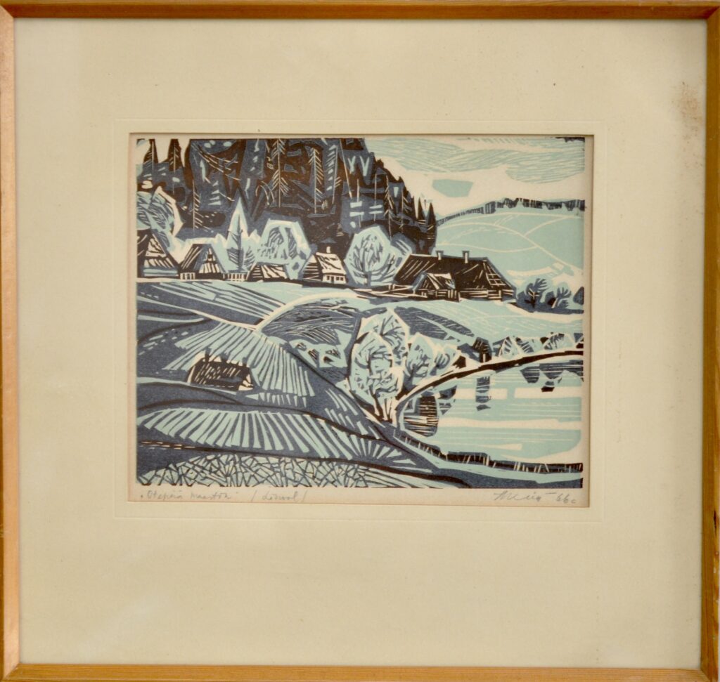 “Otepää maastik” linool 1966 ava 20,5×25 cm raamiga 37×39 cm