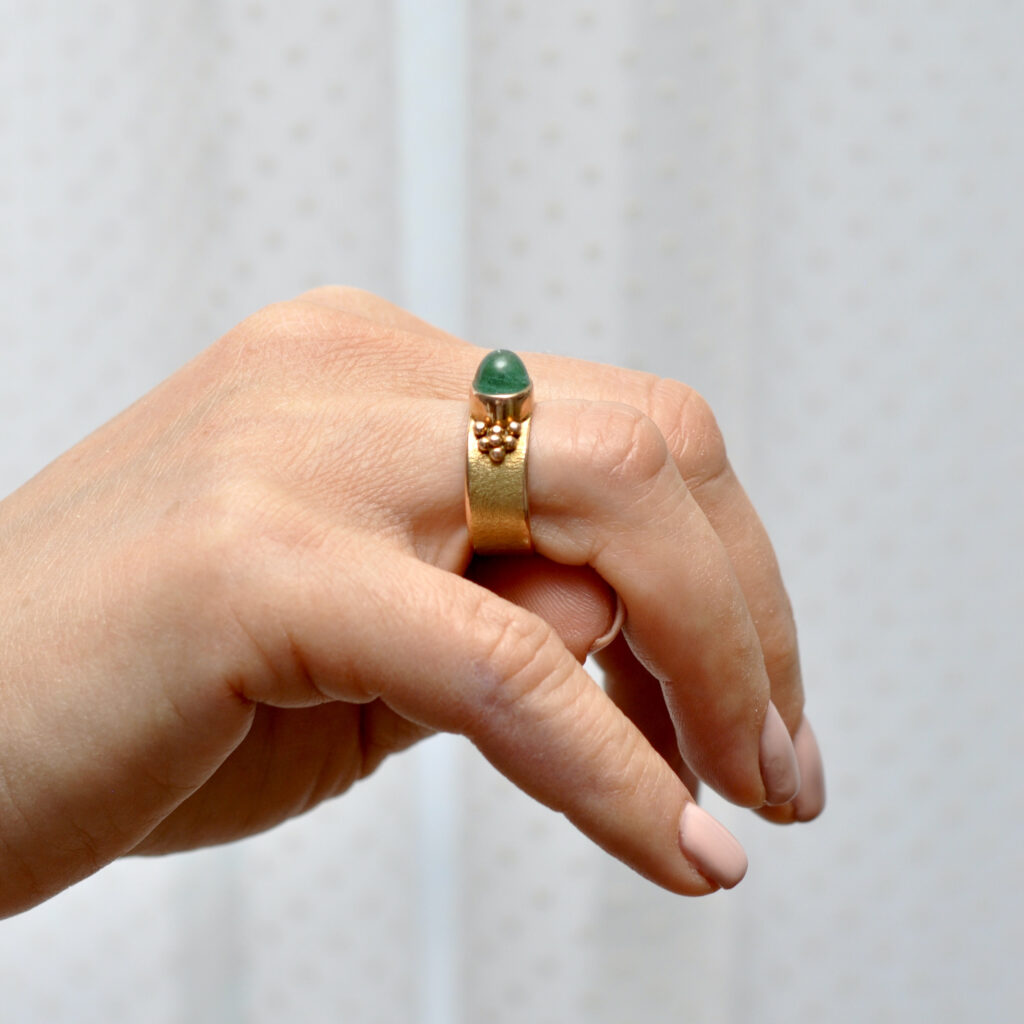 Kuldsõrmus smaragdi ja 14 kuldmunakesega.