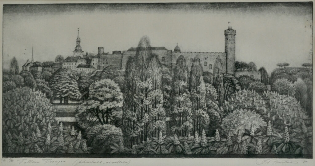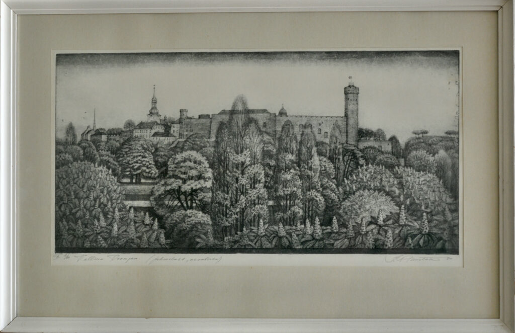 “Tallinn Toompea”pehmelakk, akvatinta II 2/50 1980 ava 27,5×51 raamiga 42×64 cm