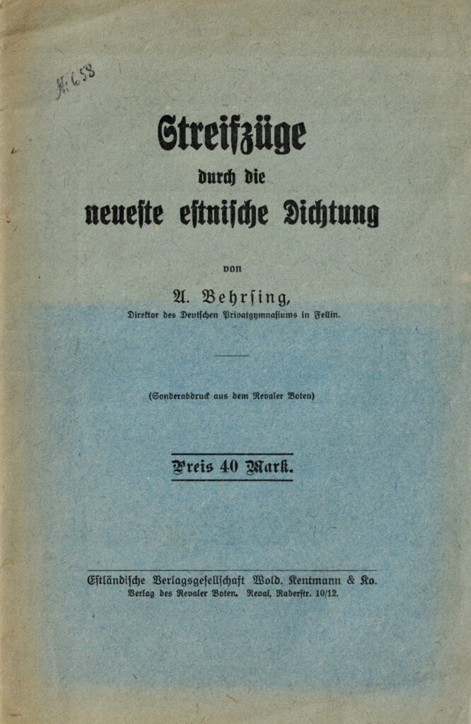 Streifzüge durch die neueste estnische Dichtung von A. Behrsing, Direktor des Deutschen Privatgymnasiums in Fellin. (Sonderabdruck aus dem Revaler Boten) Estländische Verlagsgesellschaft Wold. Kentmann & Ko. Verlag des Revaler Boten. Reval, Raderstr. 10/12.