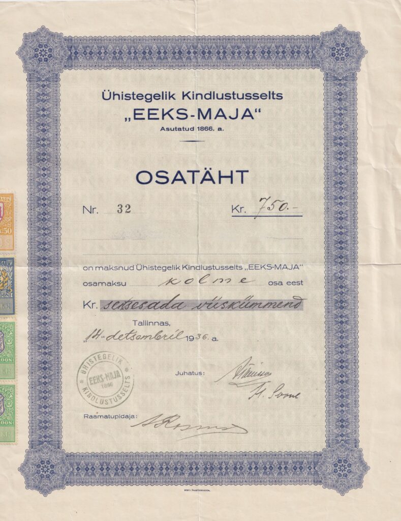 Ühistegelik Kindlustusselts EEKS-MAJA 1936 Kr 750