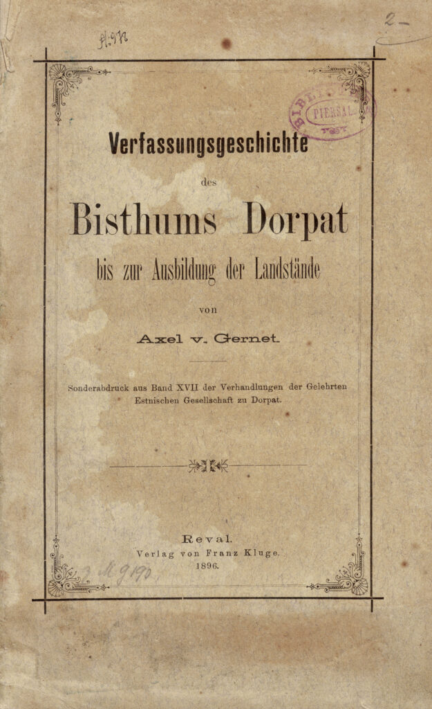 Verfassungsgeschichte des Bisthums Dorpat bis zur Ausbildung der Landstände / von Axel v. Gernet |
